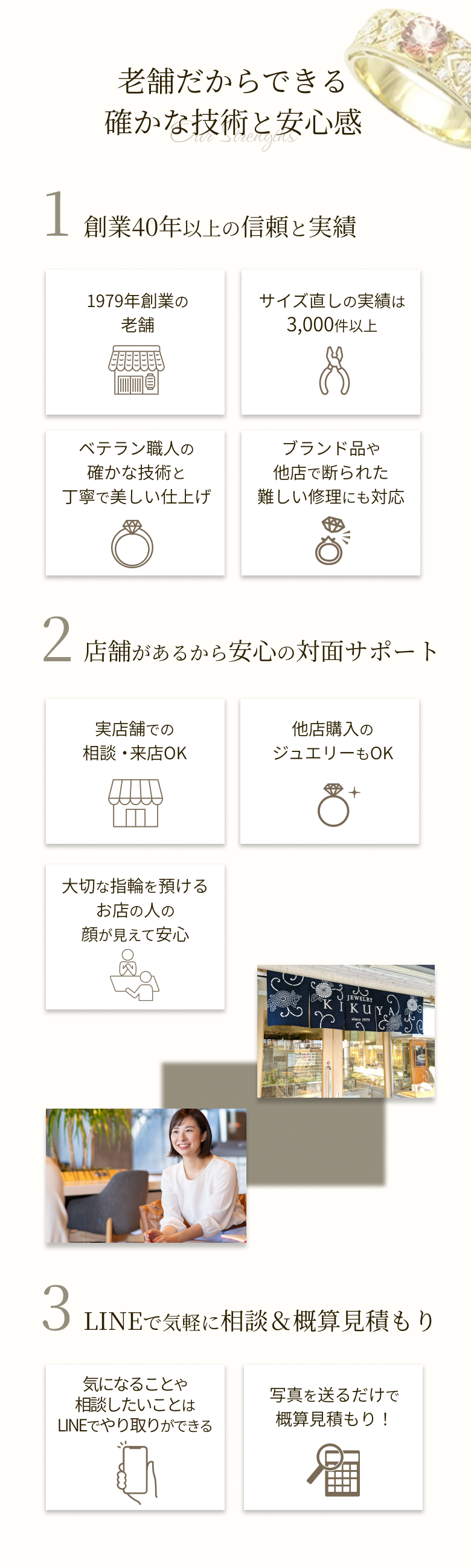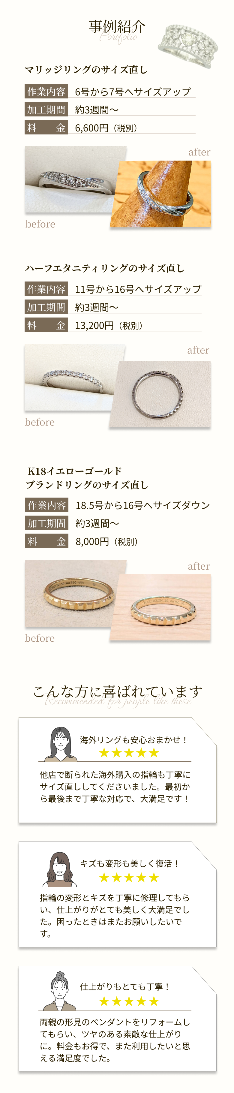はい、問題ありません。他店で購入された指輪でも、素材やデザインを確認したうえで丁寧にサイズ直しを行います。 「購入店では断られた」という場合でもご相談ください。