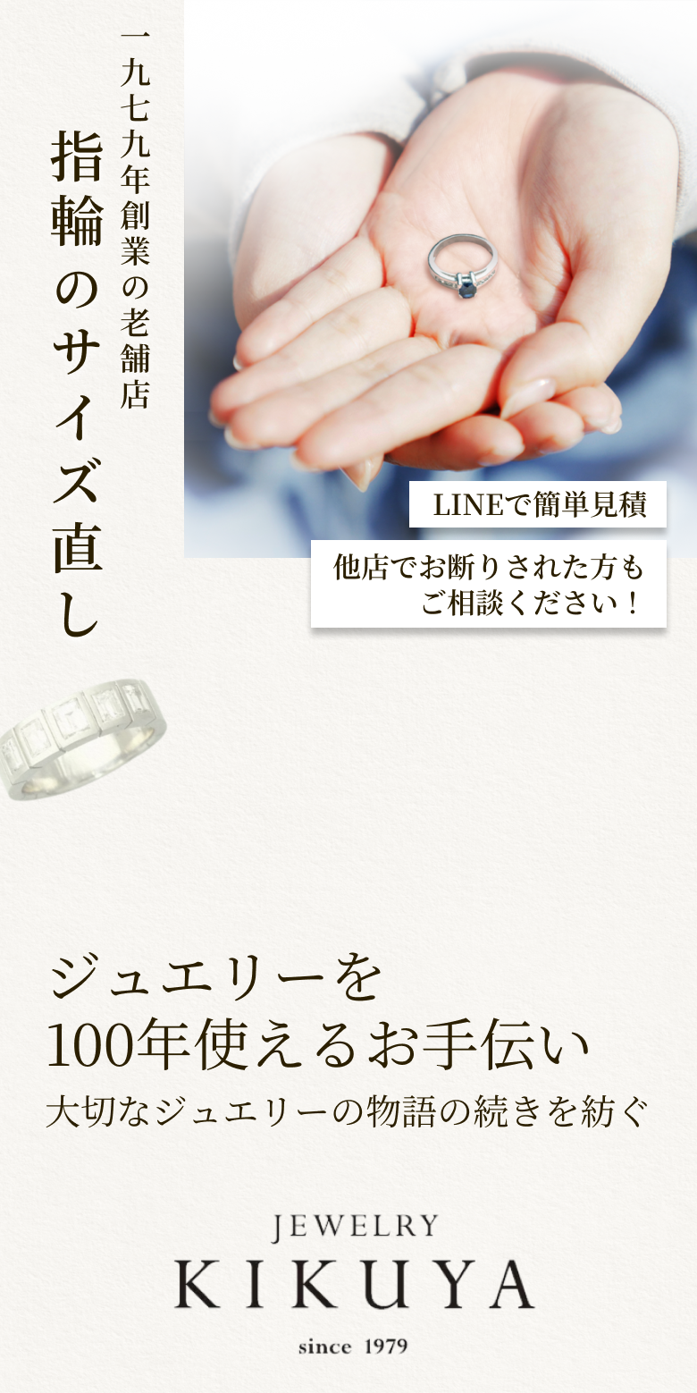 素材やデザイン、調整量によって異なりますが、目安として5,000〜7,000円台の加工が多いです。 (リングサイズを大きくする場合は、目安の金額を超えることがございます) 写真を送るだけで概算お見積りが可能ですので、まずはお気軽に写真をお送りください。 指輪を実際に確認させていただき、最終の見積もりをご案内させていただきます。