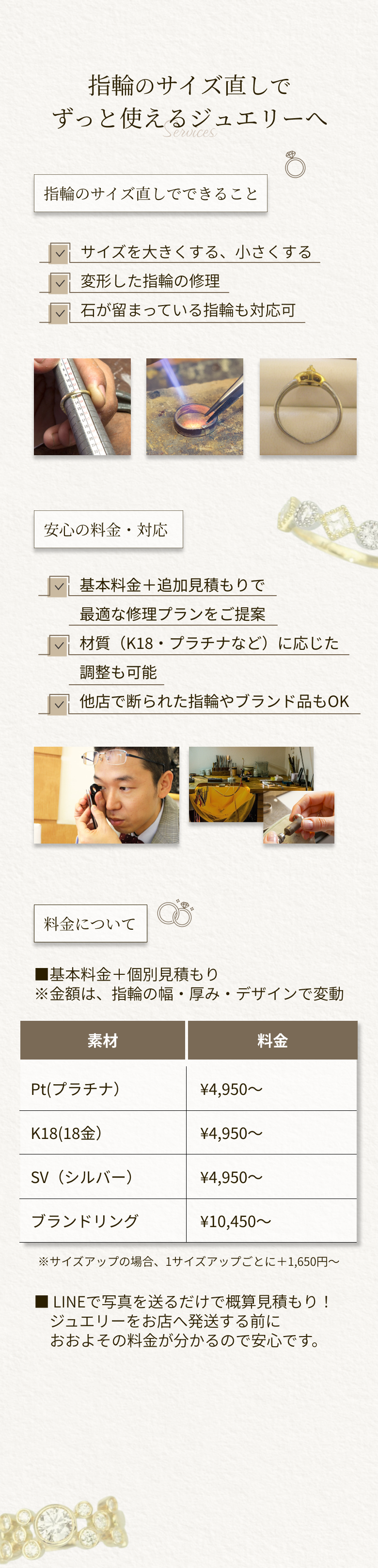素材やデザイン、調整量によって異なりますが、目安として5,000〜7,000円台の加工が多いです。 (リングサイズを大きくする場合は、目安の金額を超えることがございます) 写真を送るだけで概算お見積りが可能ですので、まずはお気軽に写真をお送りください。 指輪を実際に確認させていただき、最終の見積もりをご案内させていただきます。
