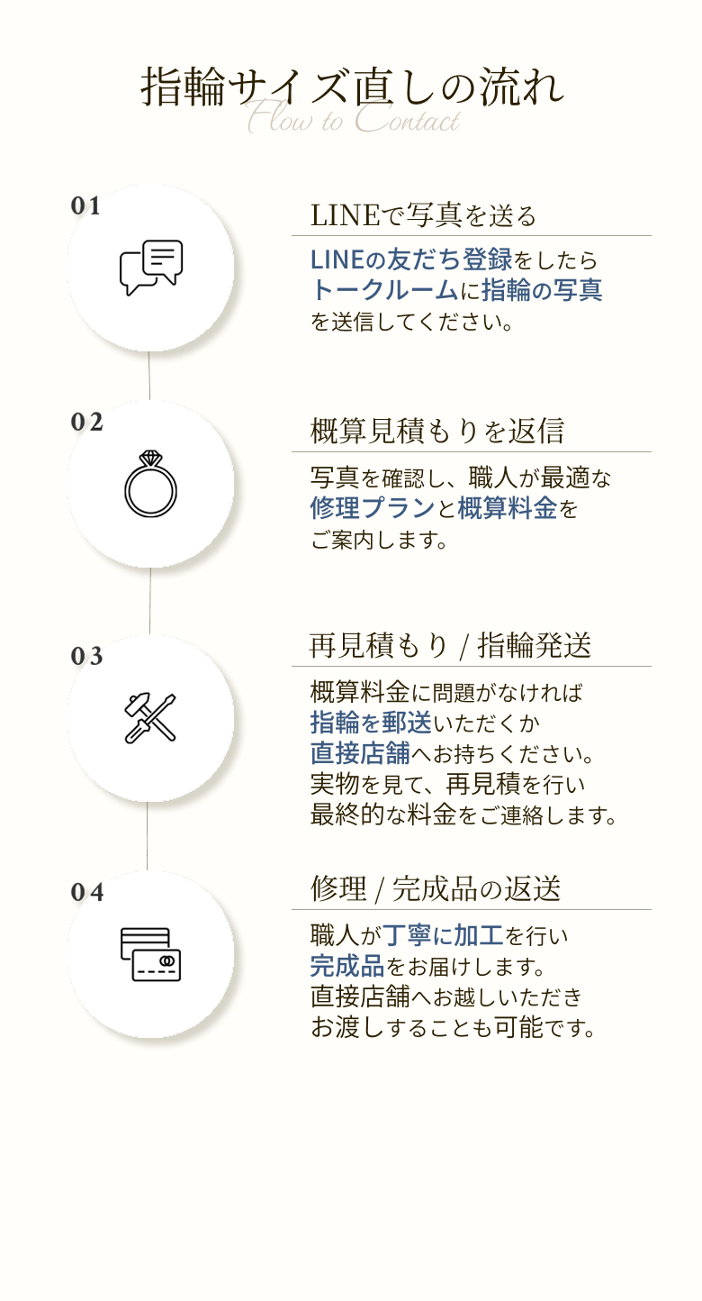 はい、問題ありません。他店で購入された指輪でも、素材やデザインを確認したうえで丁寧にサイズ直しを行います。 「購入店では断られた」という場合でもご相談ください。